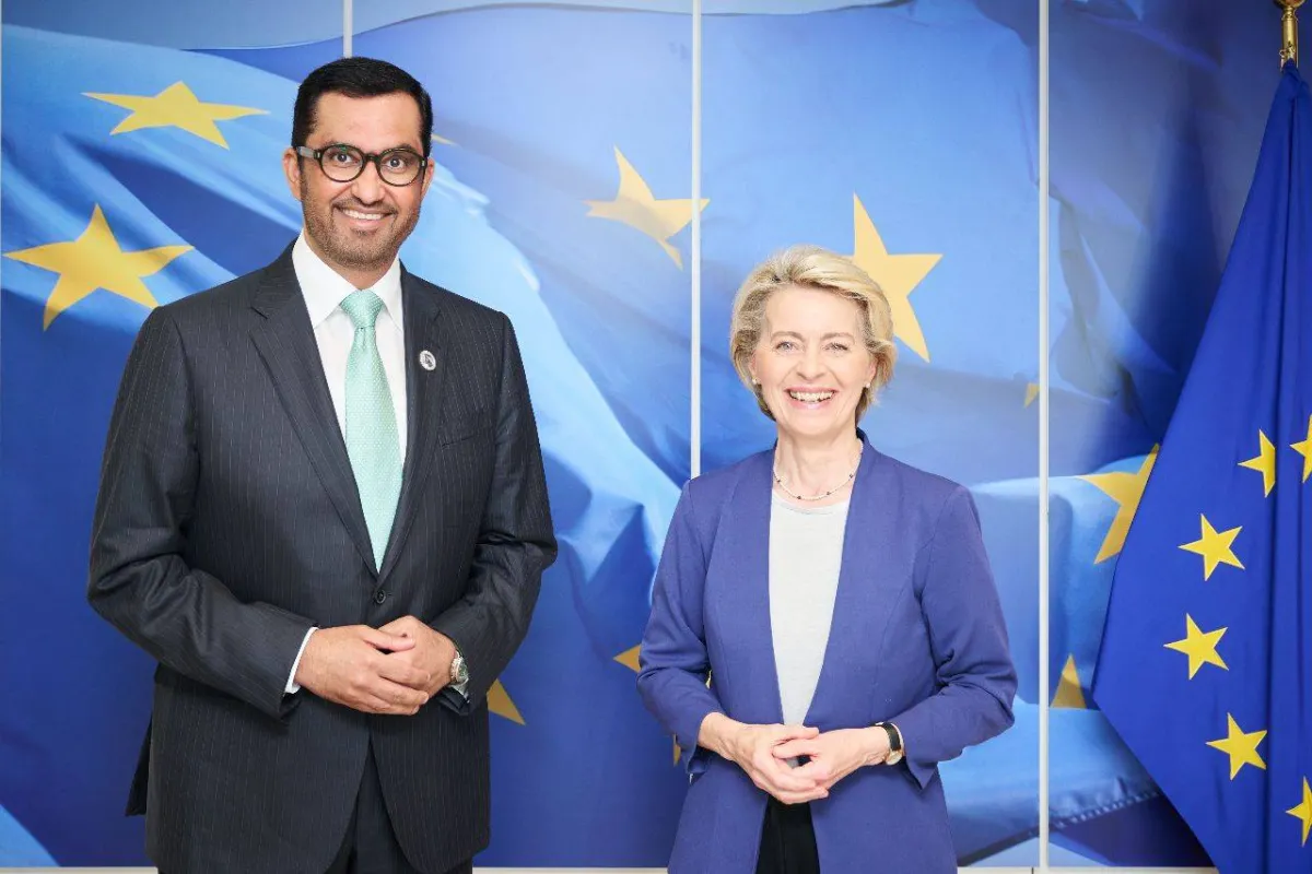 وأضاف، خلال لقائه رئيسة المفوضية الأوروبية أورسولا فون دير لاين في العاصمة البلجيكية بروكسل: «يسرّني أن المفوضية الأوروبية تدعم دعوة رئاسة مؤتمر الأطراف (كوب 28) إلى زيادة الطاقة الإنتاجية لمصادر الطاقة المتجددة 3 مرات بحلول عام 2030».
