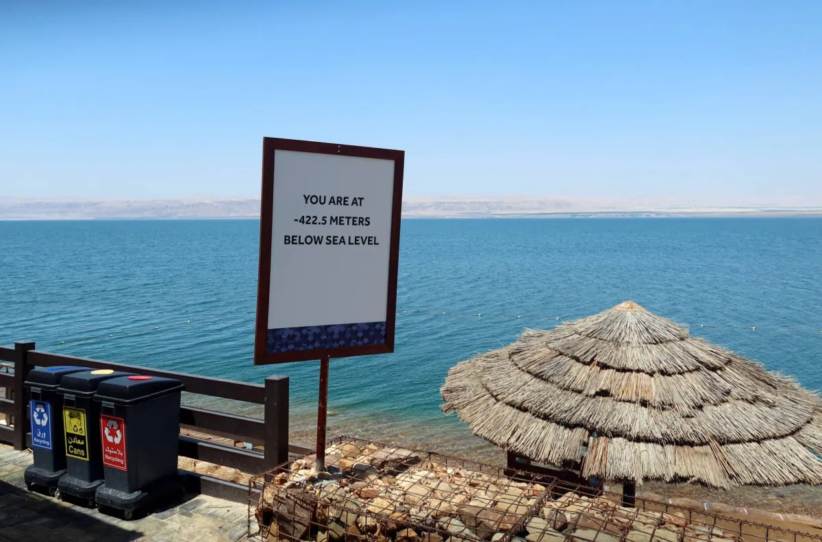 يافطة على أحد شواطئ البحر الميت في الأردن تقول «أنت هنا 422,5 متر تحت سطح البحر» (رويترز)