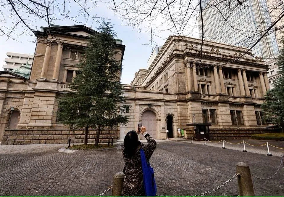 سيدة تلتقط صورة تذكارية لمقر بنك اليابان المركزي وسط العاصمة طوكيو (رويترز)