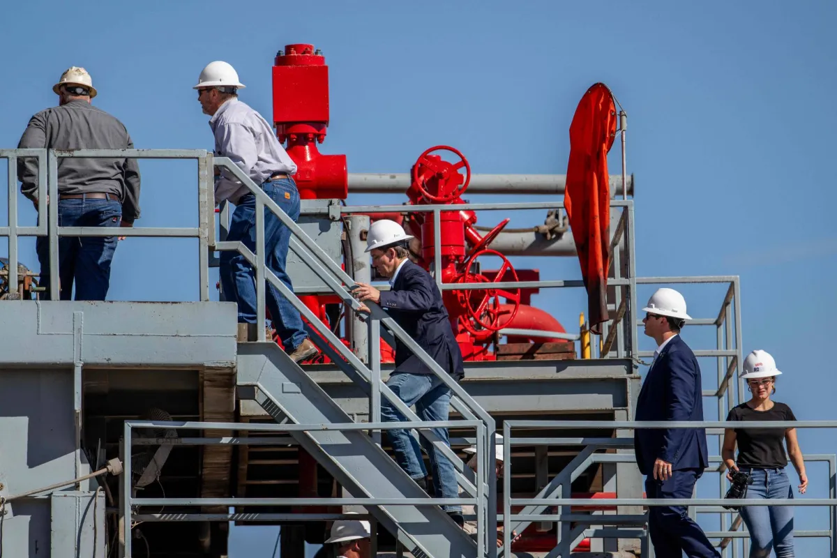 حاكم فلوريدا رون ديسانتيس (في الوسط) يقوم بجولة في منصة نفطية (أ.ف.ب)