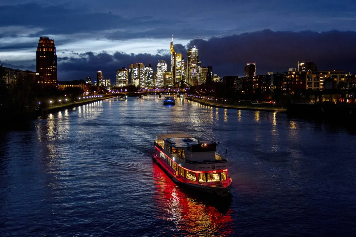 مركب رحلات تمر في نهر ماين قرب الضاحية المالية وسط مدينة فرانكفورت الألمانية (أ.ب)