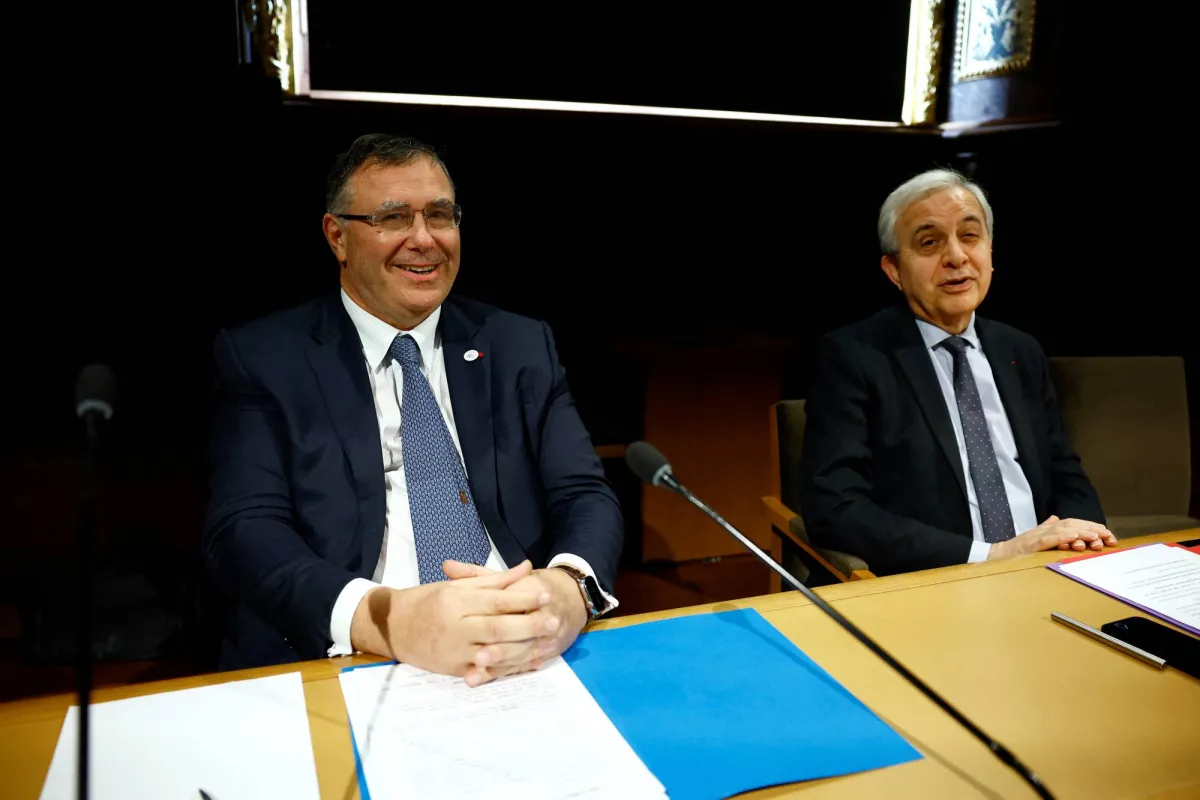 بويان وإلى جانبه النائب روجيه كاروتشي خلال جلسة استماع حول التزامات «توتال» في مجلس الشيوخ الفرنسي بباريس (رويترز)