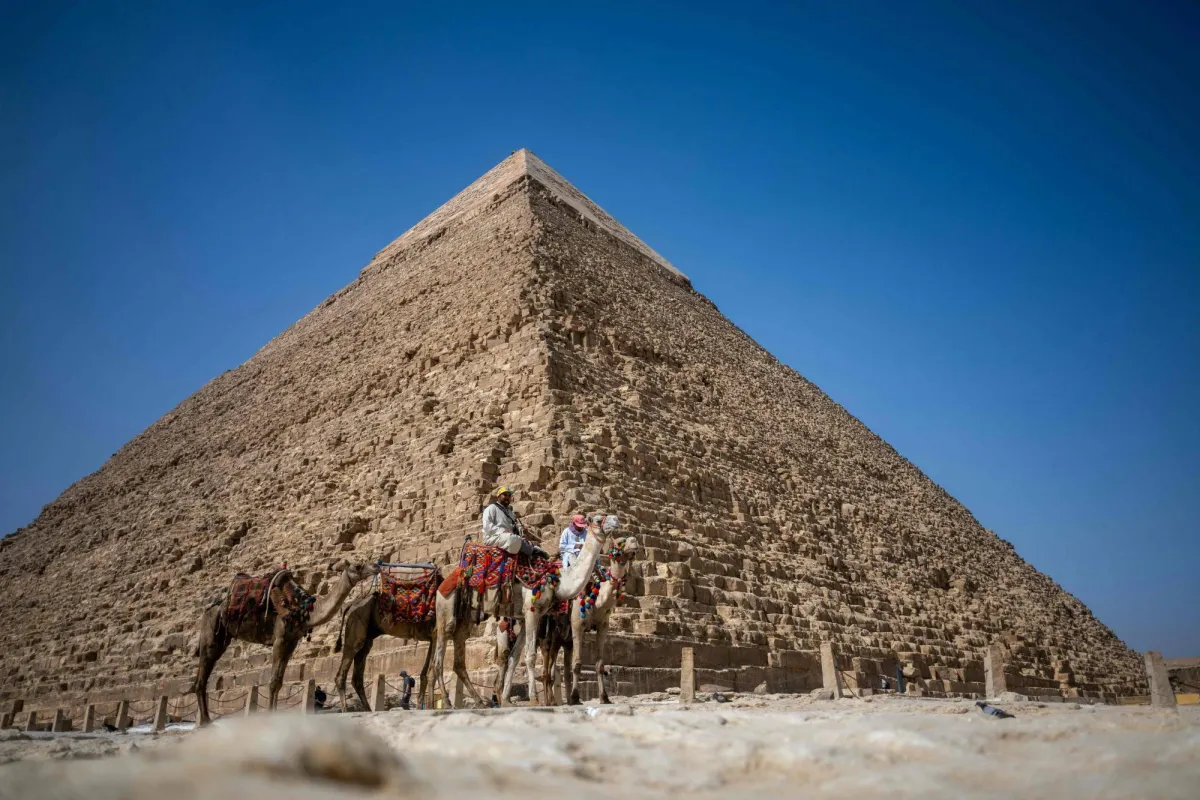 راكبو جمال عند سفح هرم خفرع بمدينة الجيزة جنوب العاصمة المصرية (أ.ف.ب)