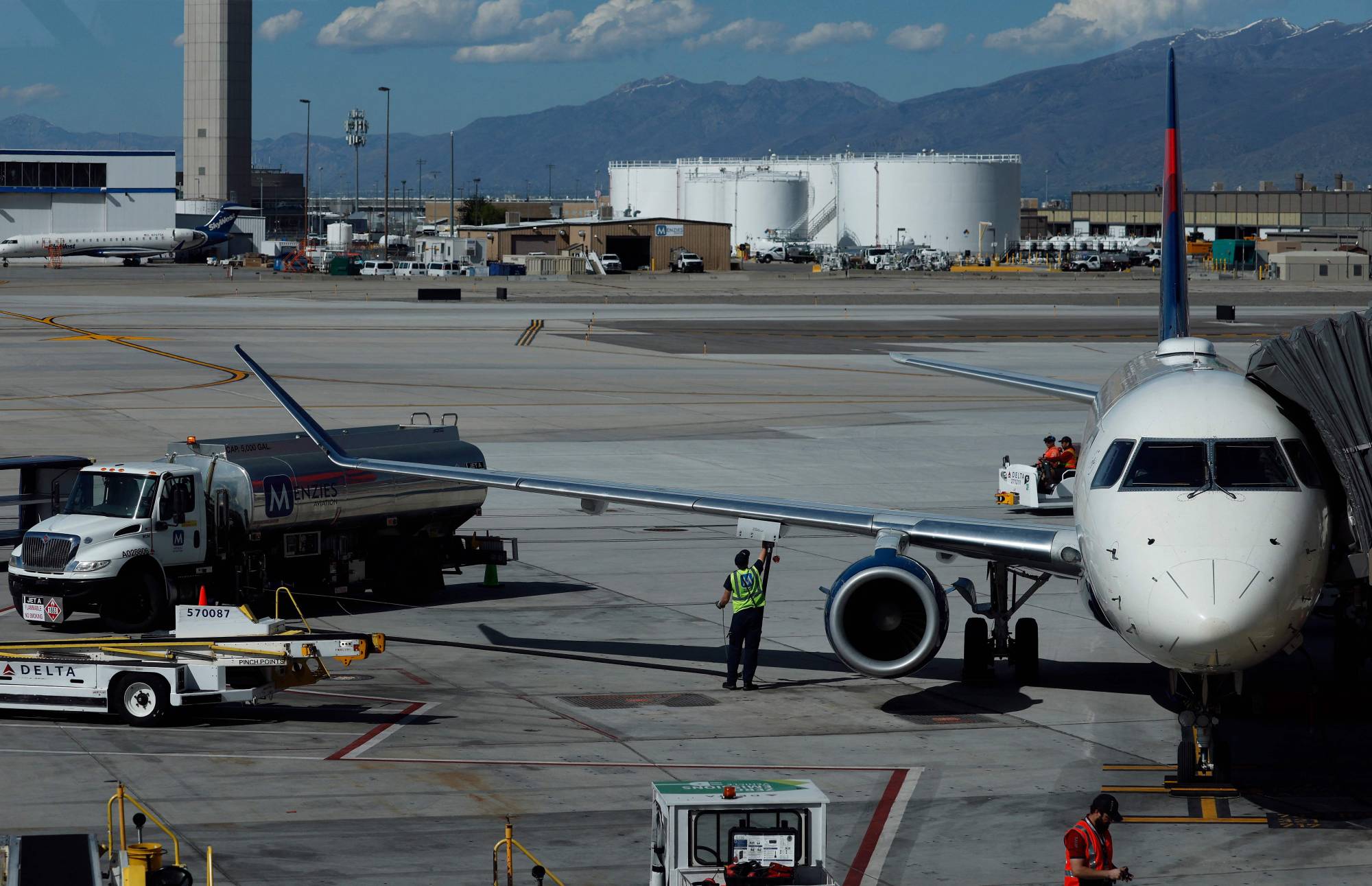 عامل يملأ طائرة تابعة لشركة «دلتا إيرلاينز» بالوقود في مطار سولت ليك سيتي الدولي بولاية يوتاه الأميركية (رويترز)