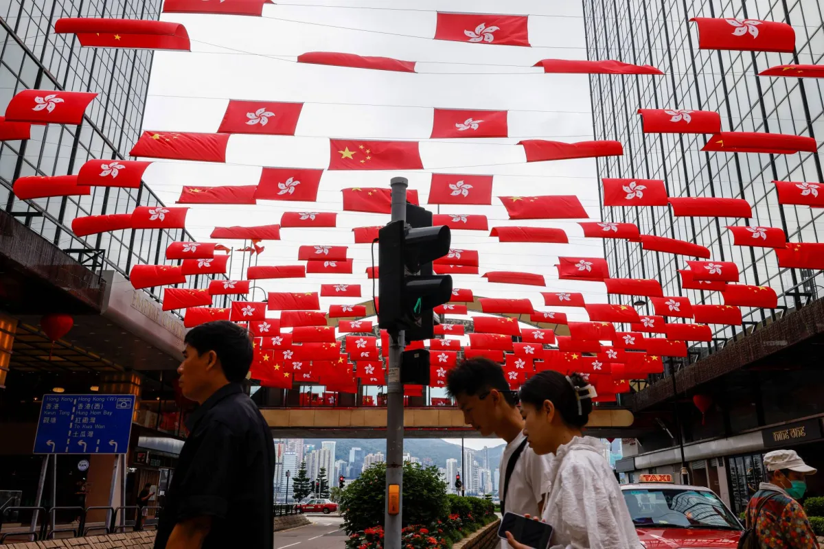 أعلام الصين وهونغ كونغ معلقة أمام أحد المراكز التجارية الكبرى في هونغ كونغ احتفالاً بالعيد الوطني للبلاد (رويترز)