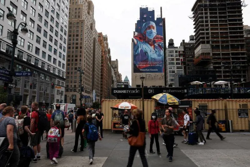 أشخاص يسيرون على زاوية الشارع 34 والشارع الثامن خارج محطة بنسلفانيا في مدينة نيويورك (رويترز)