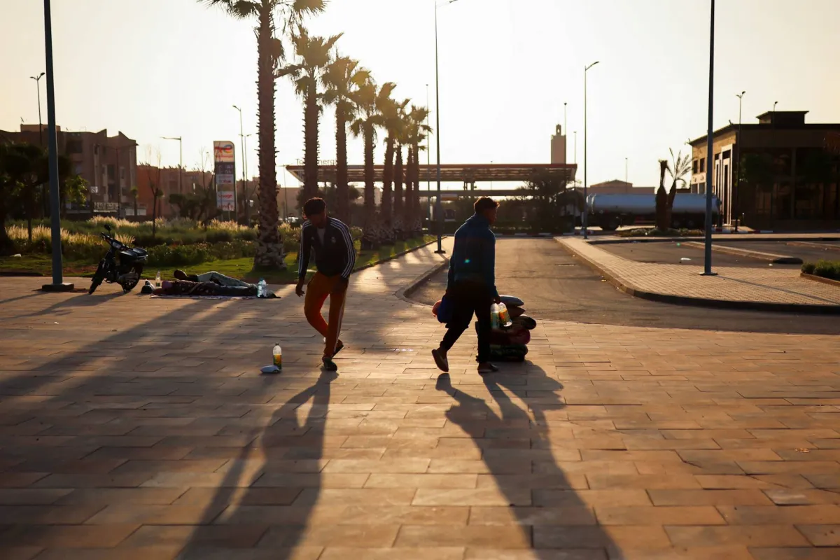 رجال يسيرون على طول الشارع بجوار محطة الحافلات الرئيسية في مراكش (رويترز)