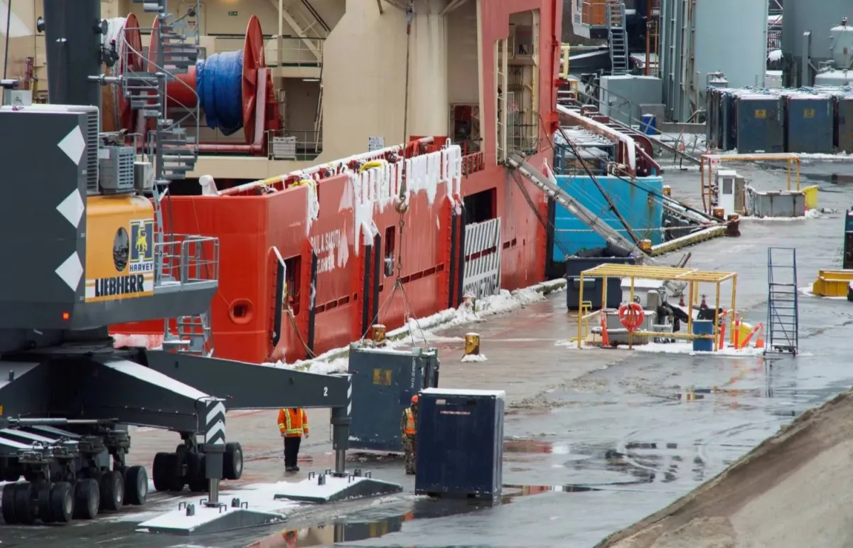 سفن إمداد تخدم منصات النفط البحرية على الساحل الشرقي لكندا تحمل بضائع في سانت جونز (رويترز)