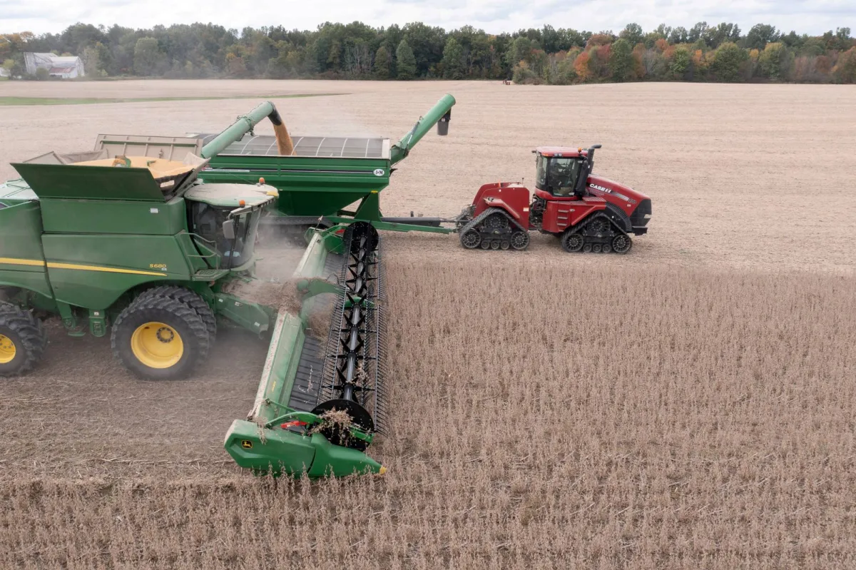 آلة حصاد فول الصويا أثناء تحميلها على حامل نقل الحبوب في ديرفيلد بأوهايو (رويترز)