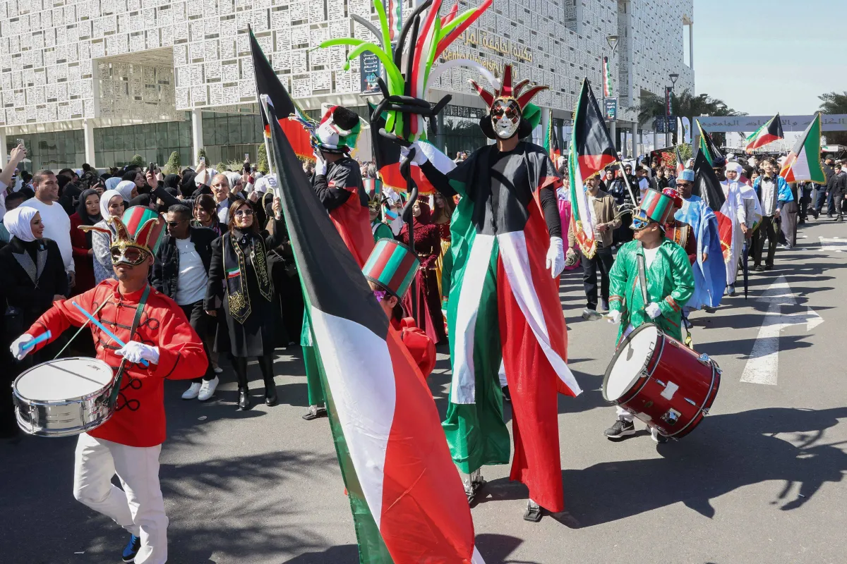 كويتيون يحملون الأعلام الوطنية في الحرم الجامعي الرئيسي بمدينة الكويت احتفالاً بالعيد الوطني الرابع والستين (أ.ف.ب)