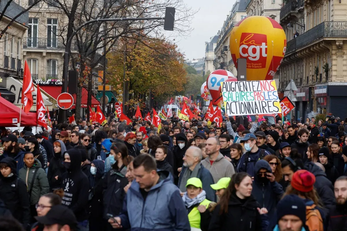 متظاهرون في مسيرة ضمن إضراب نقابة «سي جي تي» في باريس للمطالبة بزيادة الأجور والمعاشات التقاعدية (أرشيفية-رويترز)