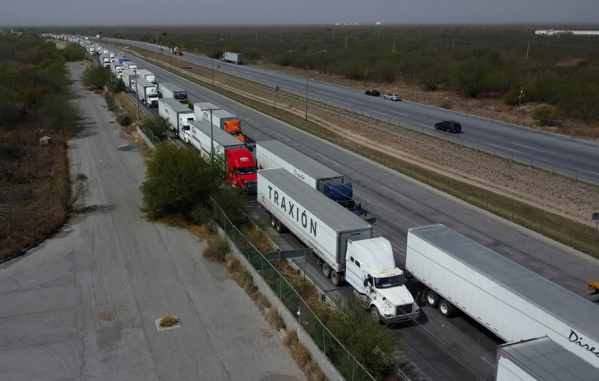 شاحنات في طابور طويل لفحص الجمارك في «نويفو لاريدو» المكسيكية للعبور إلى أميركا بعد دخول رسوم ترمب الجمركية حيز التنفيذ 4 مارس 2025 (رويترز)