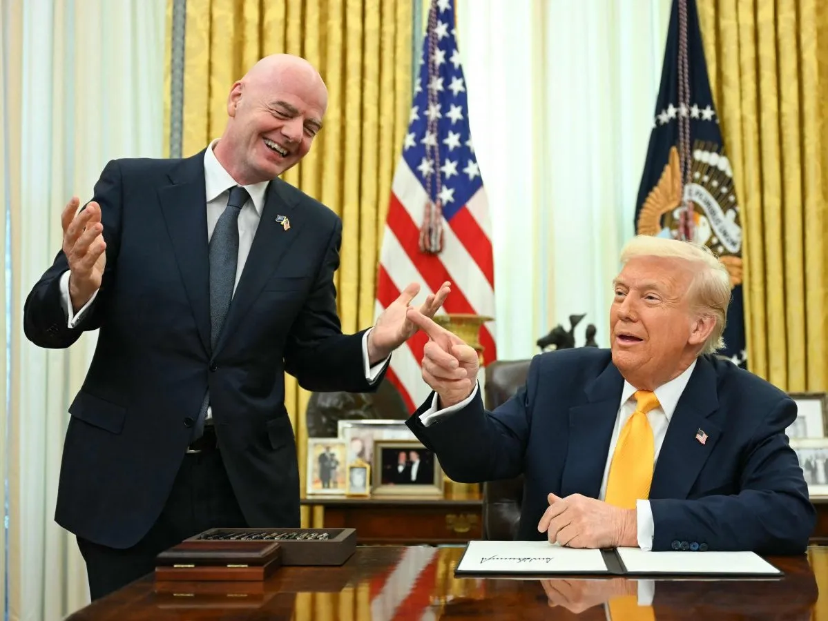 متحدثاً إلى الصحافيين، وهو جالس في المكتب البيضاوي وبجانبه يقف رئيس الاتحاد الدولي لكرة القدم (فيفا) جياني إنفانتينو، استبعد ترمب التكهنات بأن الخلاف الحالي لإدارته مع كندا والمكسيك، المشاركتين في استضافة مونديال 2026 مع الولايات المتحدة، سيؤثر على تنظيم الحدث الرياضي العالمي.