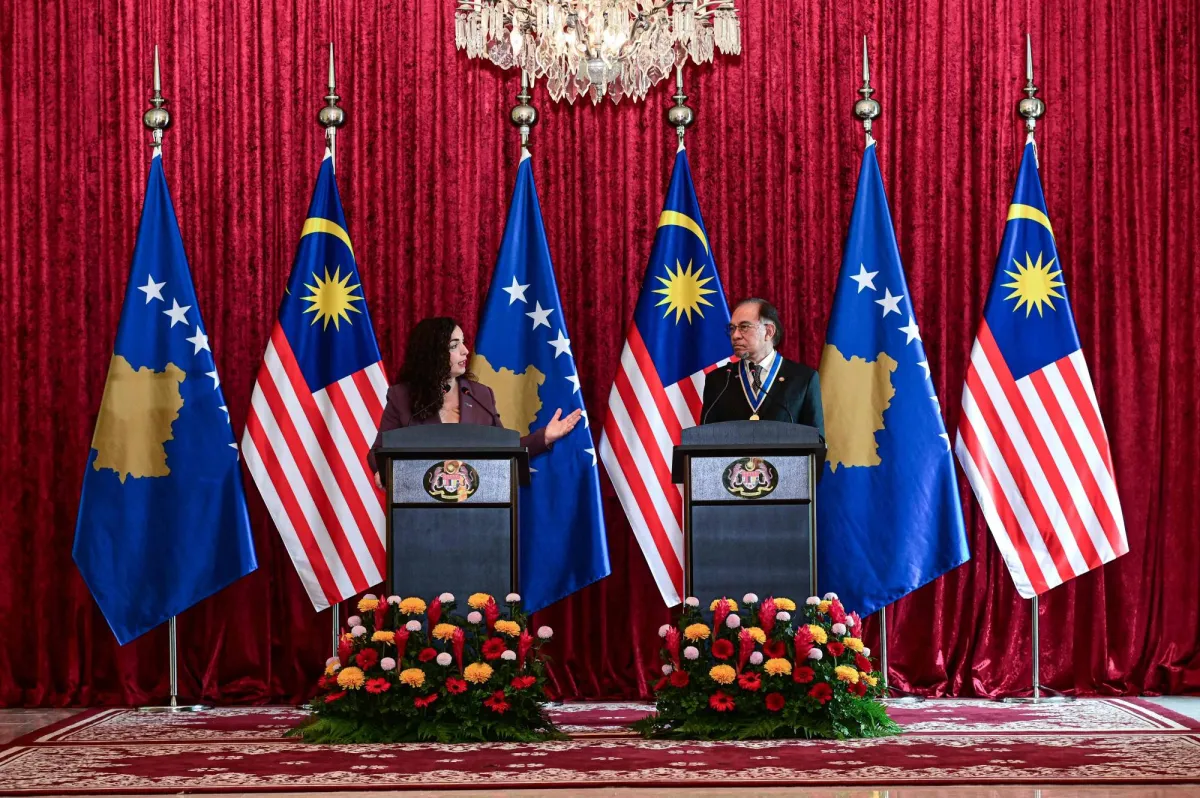 رئيسة كوسوفو فيوسا عثماني وهي تتحدث بينما يستمع رئيس الوزراء الماليزي أنور إبراهيم خلال مؤتمر صحافي مشترك (أرشيفية- رويترز)