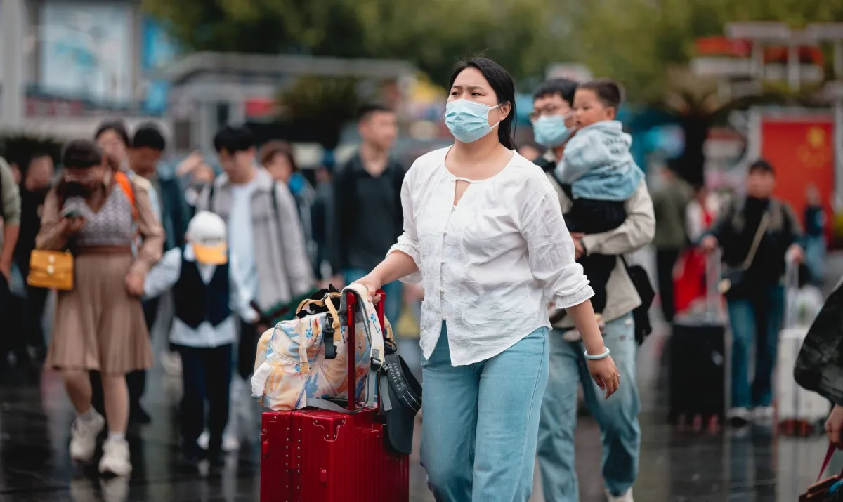 امرأة خارجة من محطة قطار بمدينة شنغهاي الصينية خلال الاحتفالات الممتدة بـ«عيد العمال»... (إ.ب.أ)
