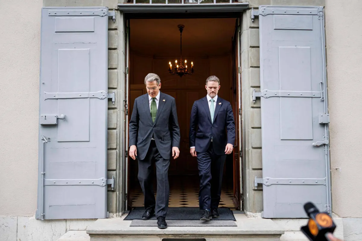 بيسنت وغرير يستعدان للتصريح إلى وسائل الإعلام بعد انتهاء المحادثات في جنيف (أ.ف.ب)