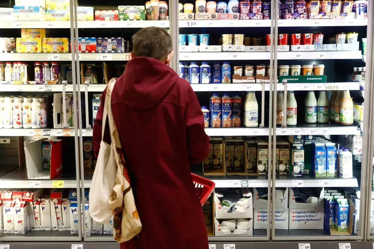 متسوق ينظر إلى رف من منتجات الألبان بمتجر «ريوي» في بوتسدام بألمانيا (رويترز)
