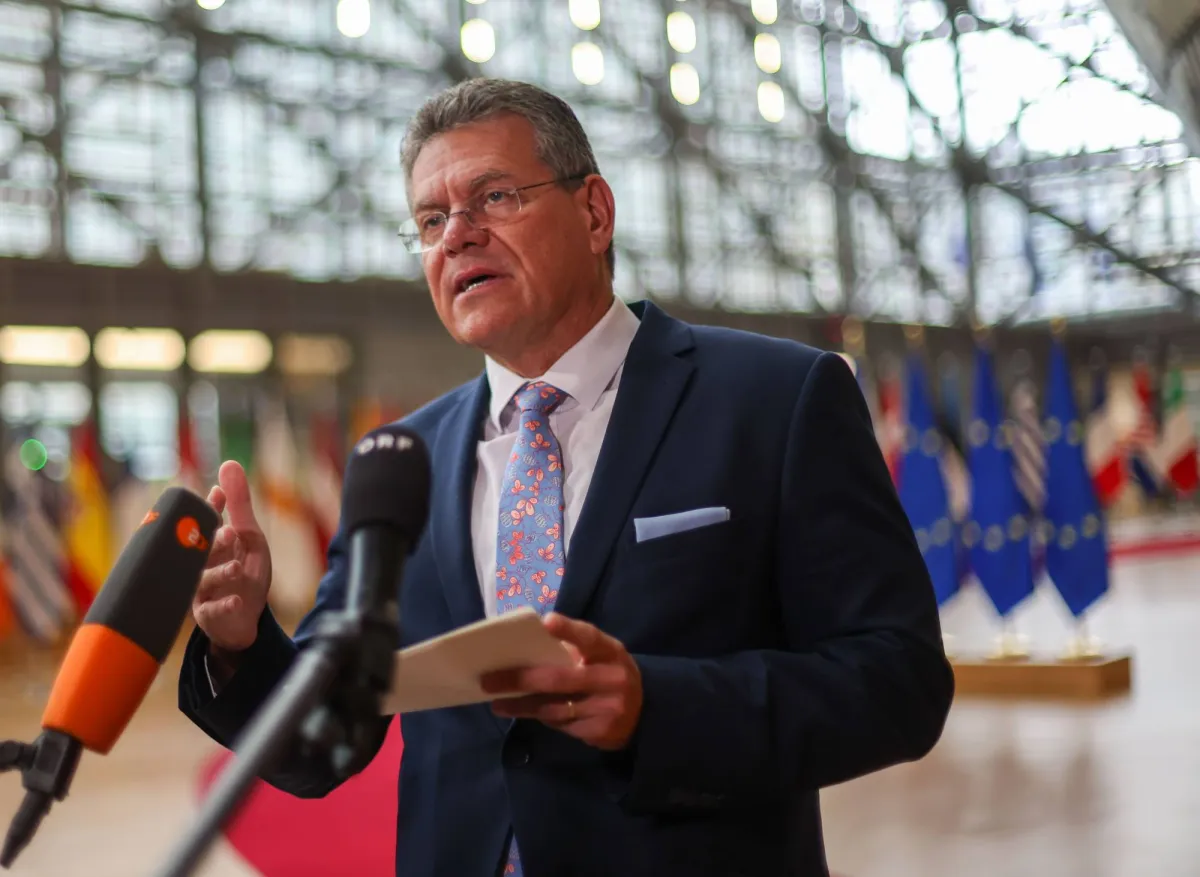 ماروس سيفكوفيتش يدلي بتصريحات للإعلام قبيل اجتماع وزراء تجارة الاتحاد الأوروبي في بروكسل 15 مايو 2025 (إ.ب.أ)