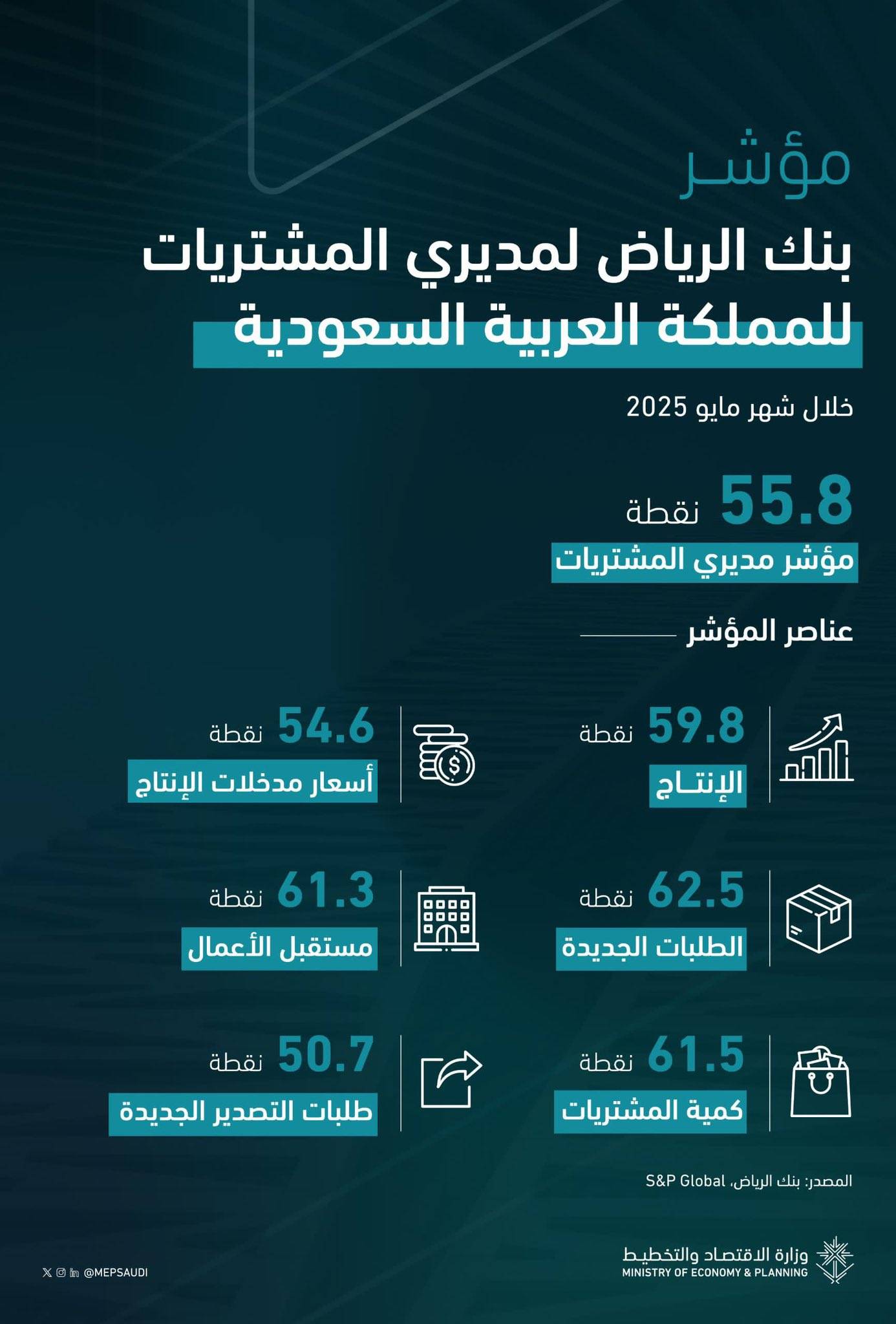 وأشار مؤشر بنك الرياض لمديري المشتريات (PMI) إلى ارتفاع في مايو، مسجلاً 55.8 نقطة، وهو ما يعكس تحسناً قوياً في ظروف الأعمال، وإن كان أقل من الذروة التي سجلها المؤشر في بداية العام.