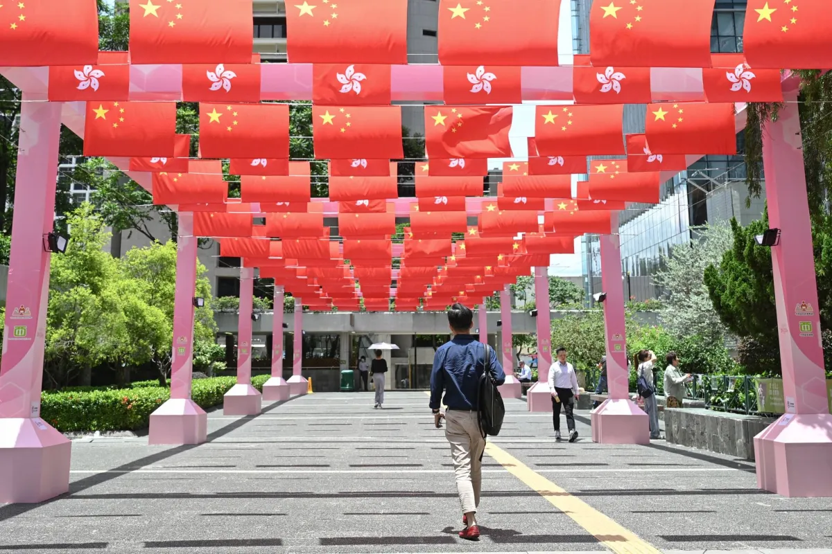 مشاة يسيرون في أحد شوارع مدينة هونغ كونغ تحت أعلام الجزيرة وأعلام الصين بمناسبة الاحتفال بذكرى عودة الجزيرة إلى السيادة الصينية (أ.ف.ب)