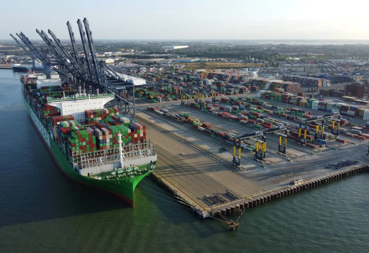 سفينة حاويات راسية بجوار رافعات في فيليكستو- بريطانيا (رويترز)