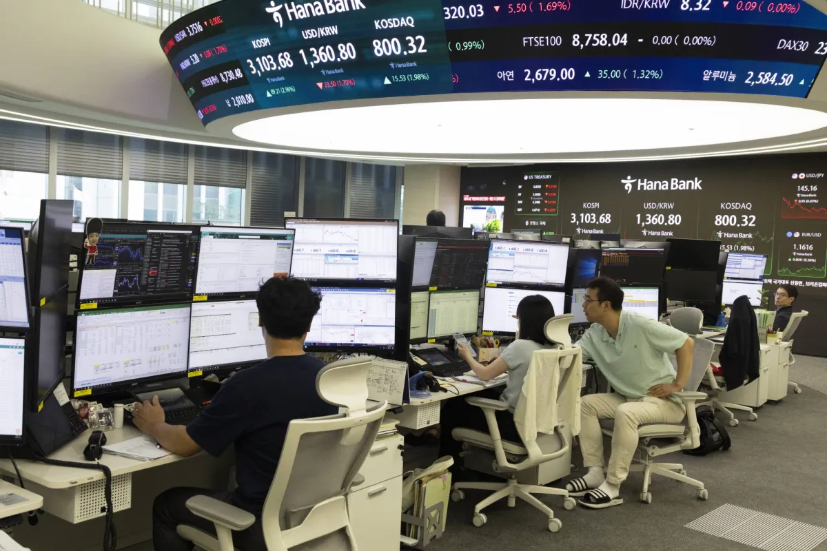 متداولون كوريون يتابعون مؤشر «كوسبي» في بنك «هانا» بسيول (إ.ب.أ)