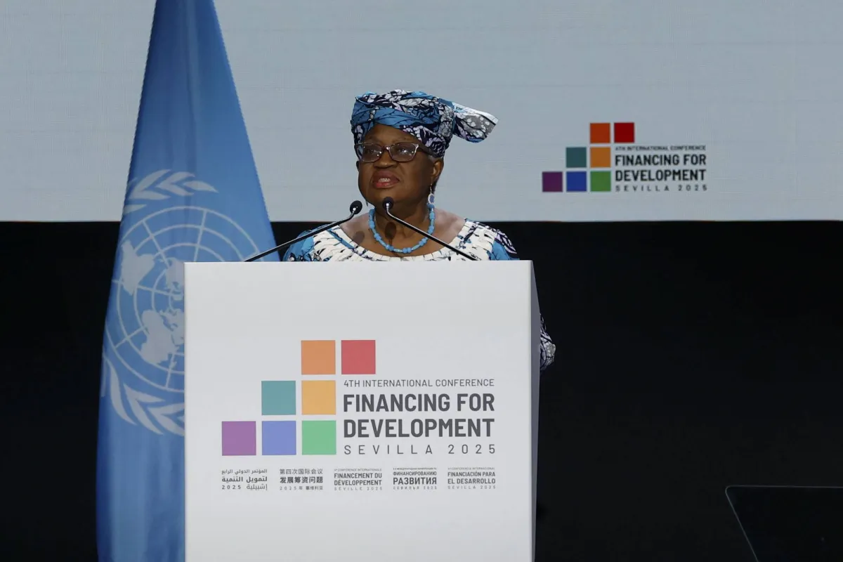 مديرة «منظمة التجارة العالمية» نغوزي أوكونجو إيويالا خلال كلمة لها أمام «مؤتمر المالية» بمدينة إشبيلية بإسبانيا يوم الاثنين (إ.ب.أ)