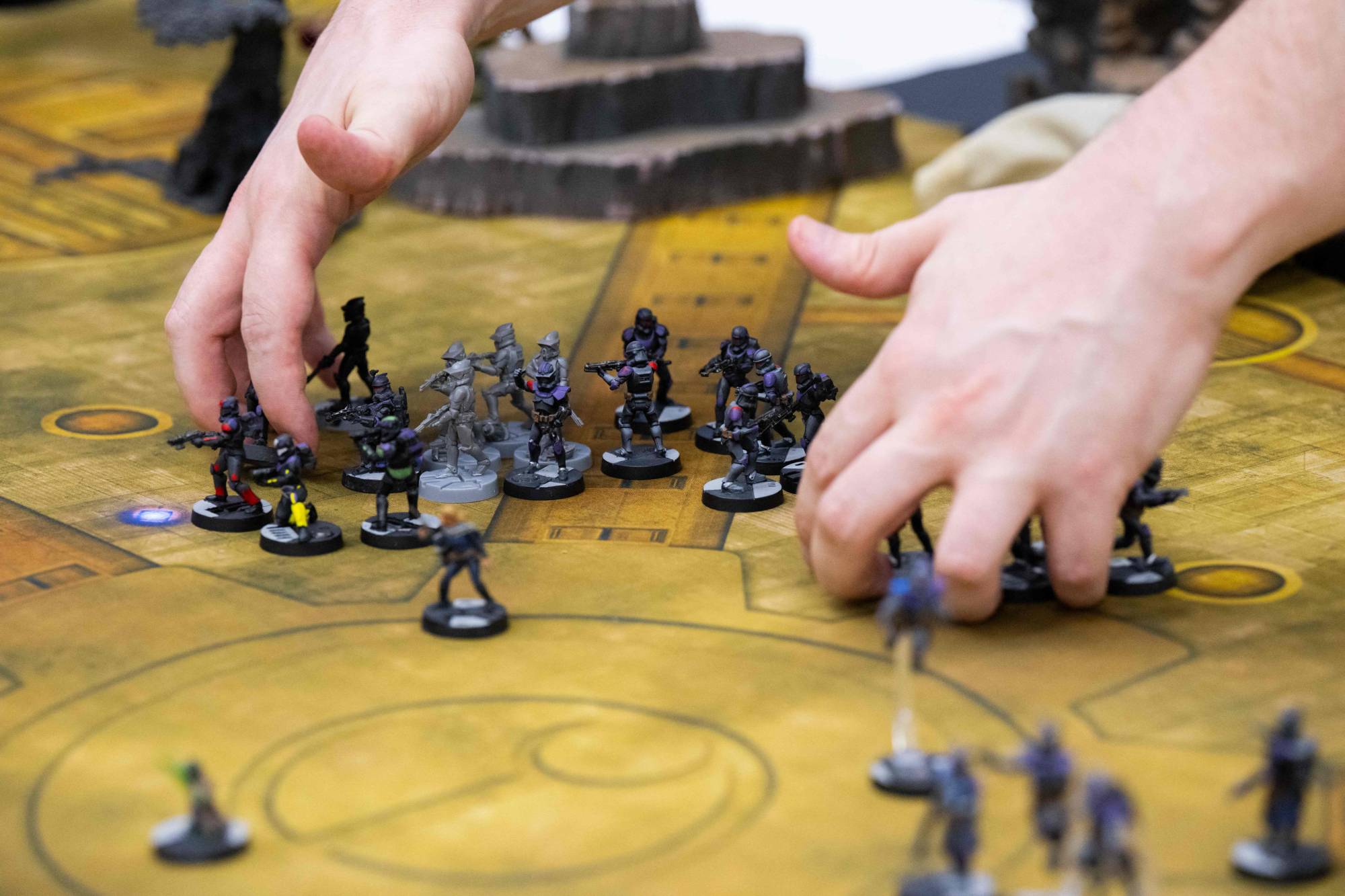 لاعب يحرك قطعاً من لعبة «حرب النجوم ليجيون» المصنوعة في الصين داخل متجر «جيم كاسل» بكوليدج بارك (أ.ف.ب)
