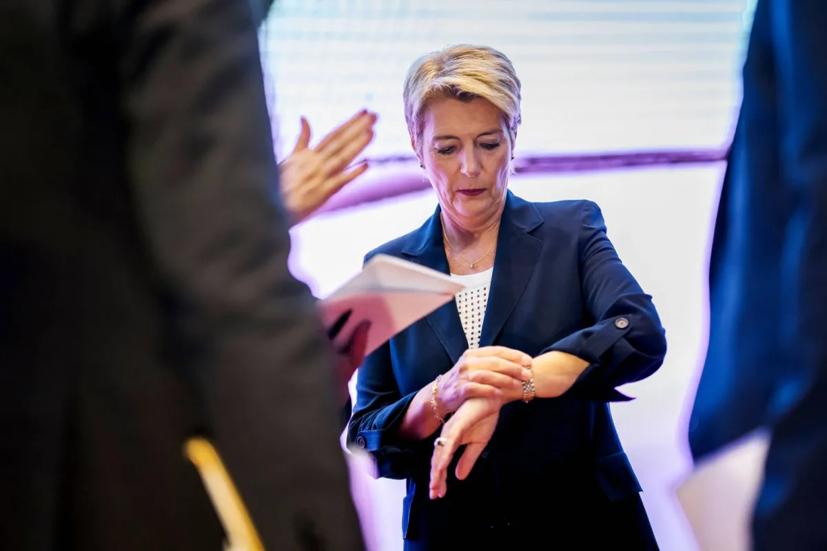 رئيسة سويسرا كارين كيلر - سوتر تتأهب لمؤتمر صحافي عقب اجتماع طارئ للحكومة الفيدرالية يوم الخميس في العاصمة برن (أ.ف.ب)