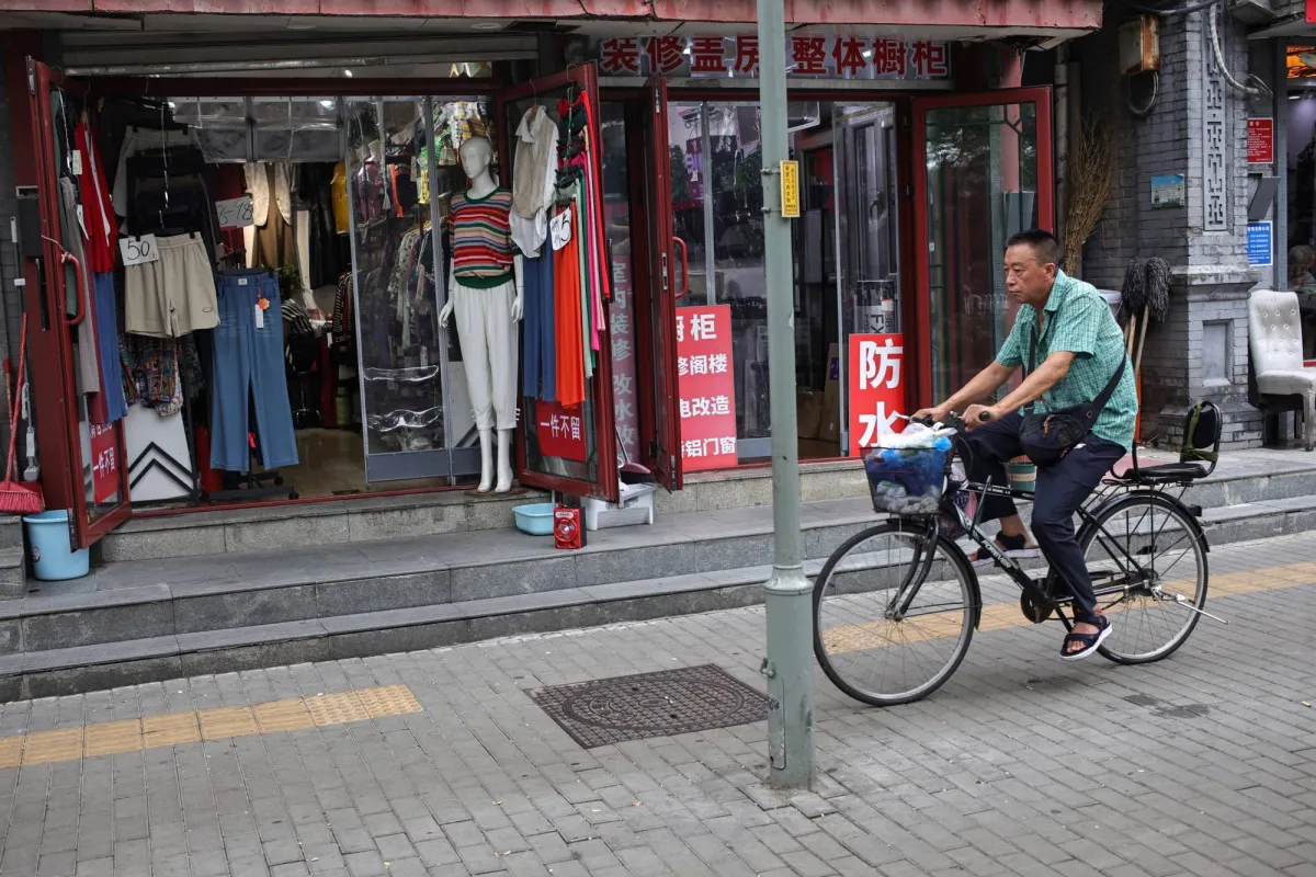 رجل على دراجة في أحد الشوارع التجارية بالعاصمة الصينية بكين (إ.ب.أ)