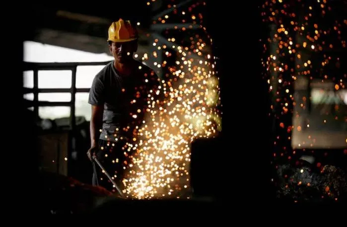 عامل في خط إنتاج معالجة الصلب بمصنع بمدينة ماندي جوبيندغاره بالهند (رويترز)