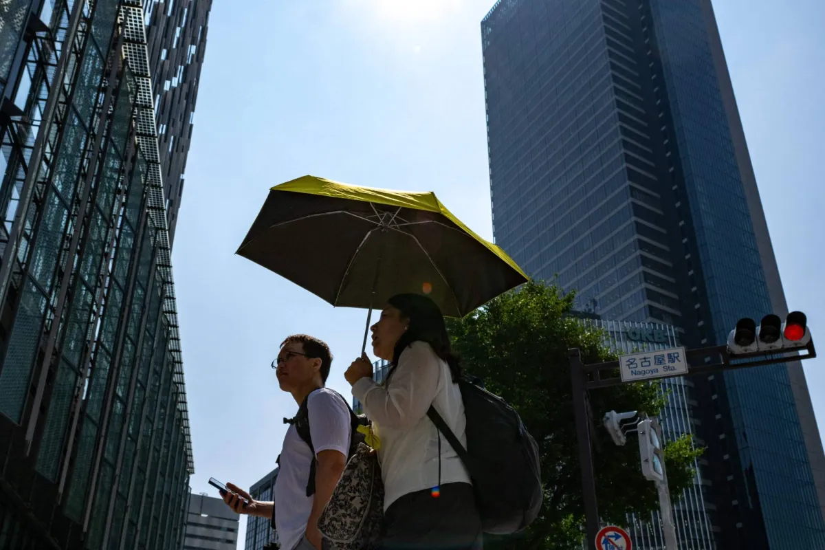 يابانيون يستخدمون المظلات وسط موجة حارة في أحد الأحياء التجارية بمدينة ناغويا (أ.ف.ب)