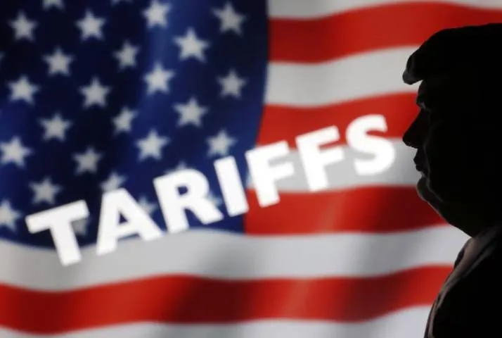 مجسّم مصغر مطبوع بتقنية ثلاثية الأبعاد للرئيس دونالد ترمب وعلم الولايات المتحدة وكلمة «الرسوم الجمركية» في هذا الرسم التوضيحي (رويترز)