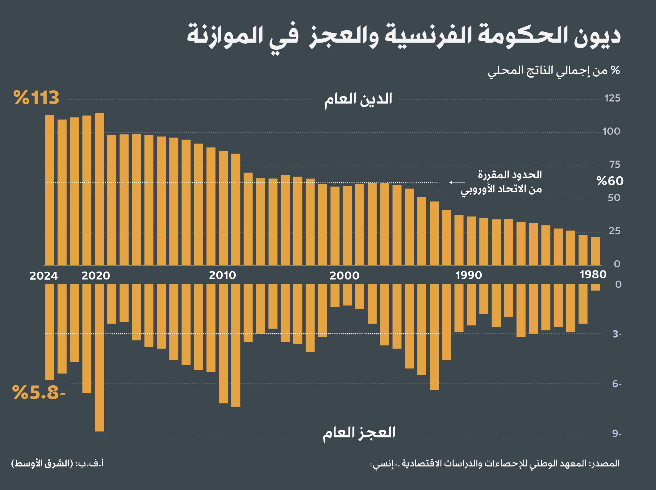 وفقاً للمعهد الوطني الفرنسي للإحصاء والدراسات الاقتصادية، بلغ الدين العام الفرنسي 3.345 تريليون يورو في نهاية الربع الأول من عام 2025. وقد ارتفع هذا الرقم بشكل كبير على مدار العقدين الماضيين. فبعد أن كان يمثل 60 في المائة من الناتج المحلي الإجمالي في بداية الألفية، تجاوز حاجز 100 في المائة في عام 2020 بسبب جائحة «كورونا»، وواصل ارتفاعه ليصل إلى 113.9 في المائة من الناتج المحلي الإجمالي هذا العام، وفق تقرير لصحيفة «لوموند» الفرنسية.