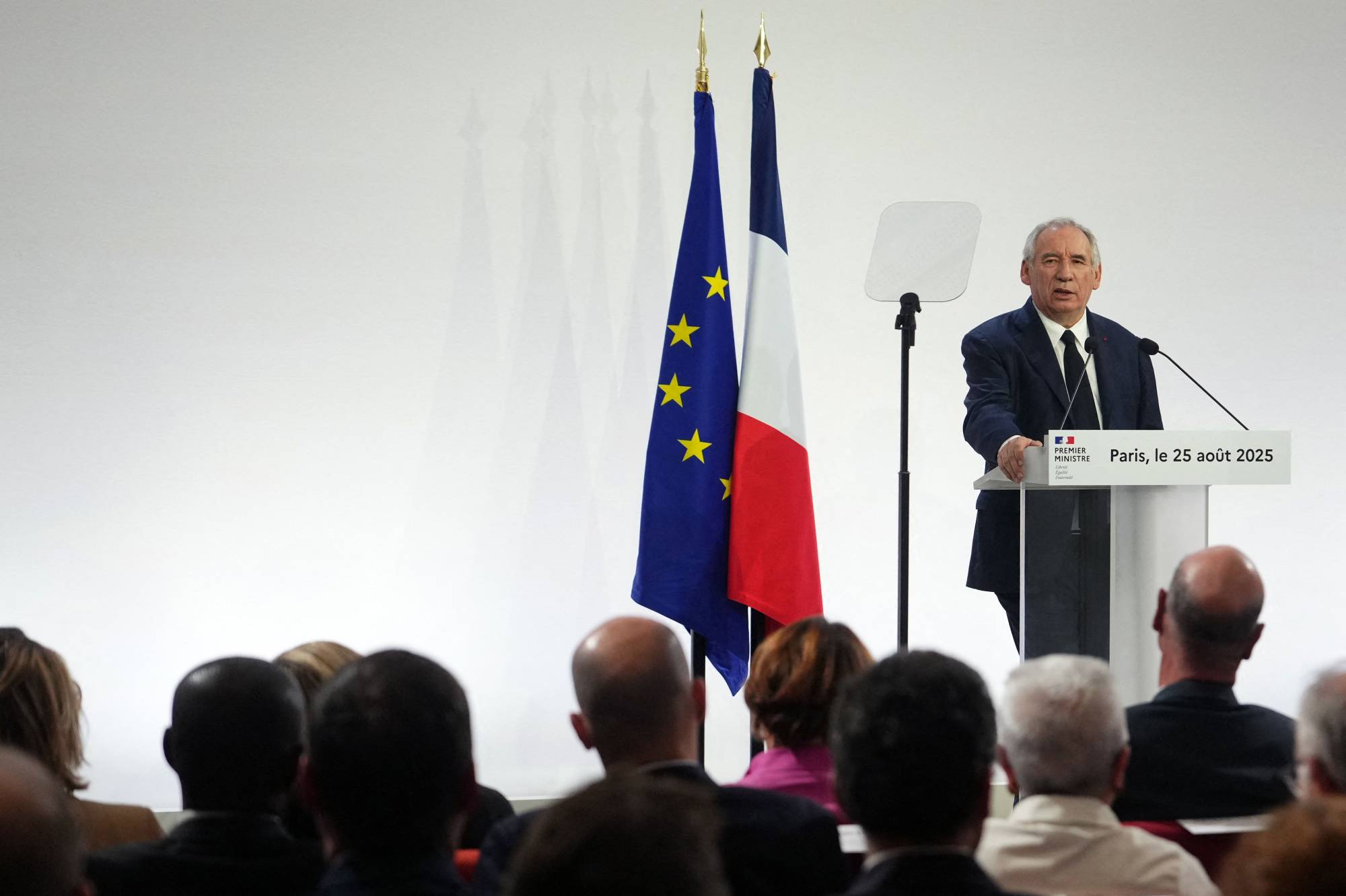 رئيس الوزراء الفرنسي فرنسوا بايرو يتحدث أمام وزراء حكومته خلال مؤتمر صحافي في باريس في 25 أغسطس (أ.ف.ب)