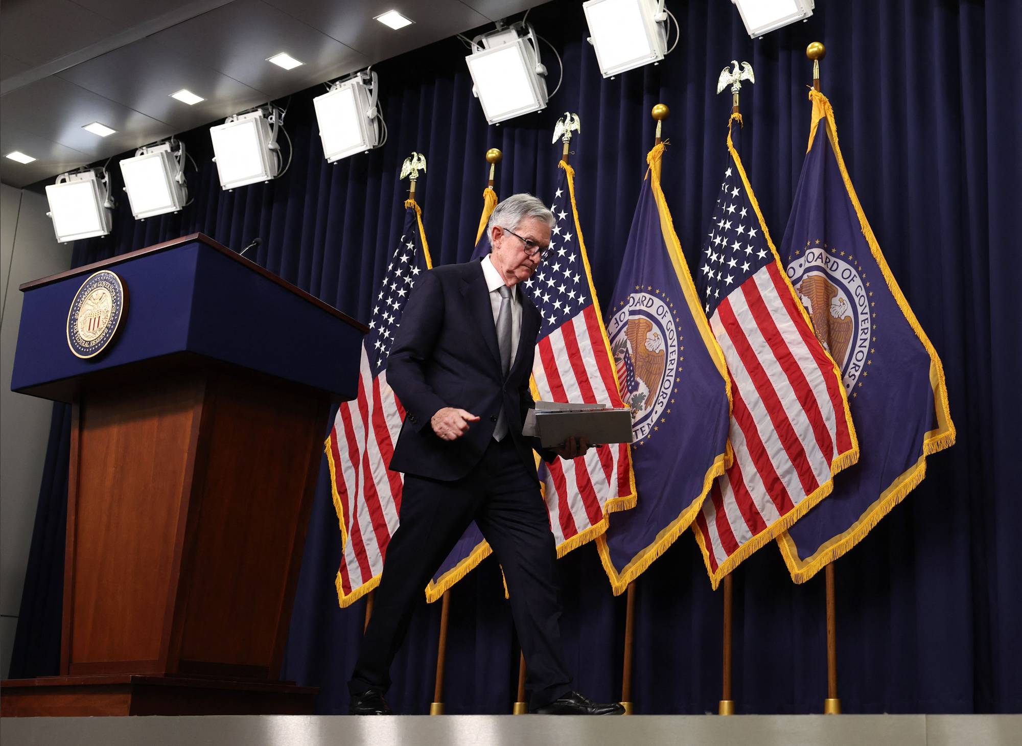 رئيس «الاحتياطي الفيدرالي» جيروم باول يهمّ بالمغادرة بعد انتهاء مؤتمره الصحافي (أرشيفية-أ.ف.ب)