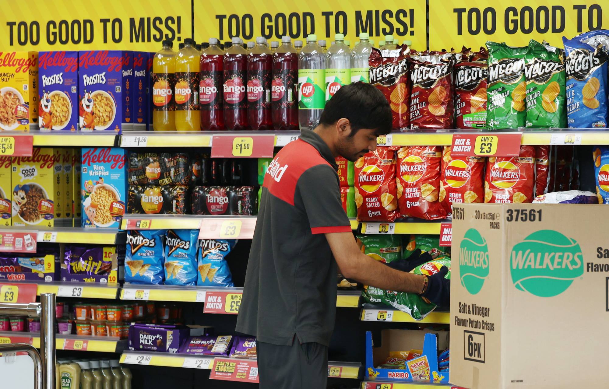 موظف في أحد المتاجر الكبرى في لندن يقوم بتحميل الرفوف (إ.ب.أ)