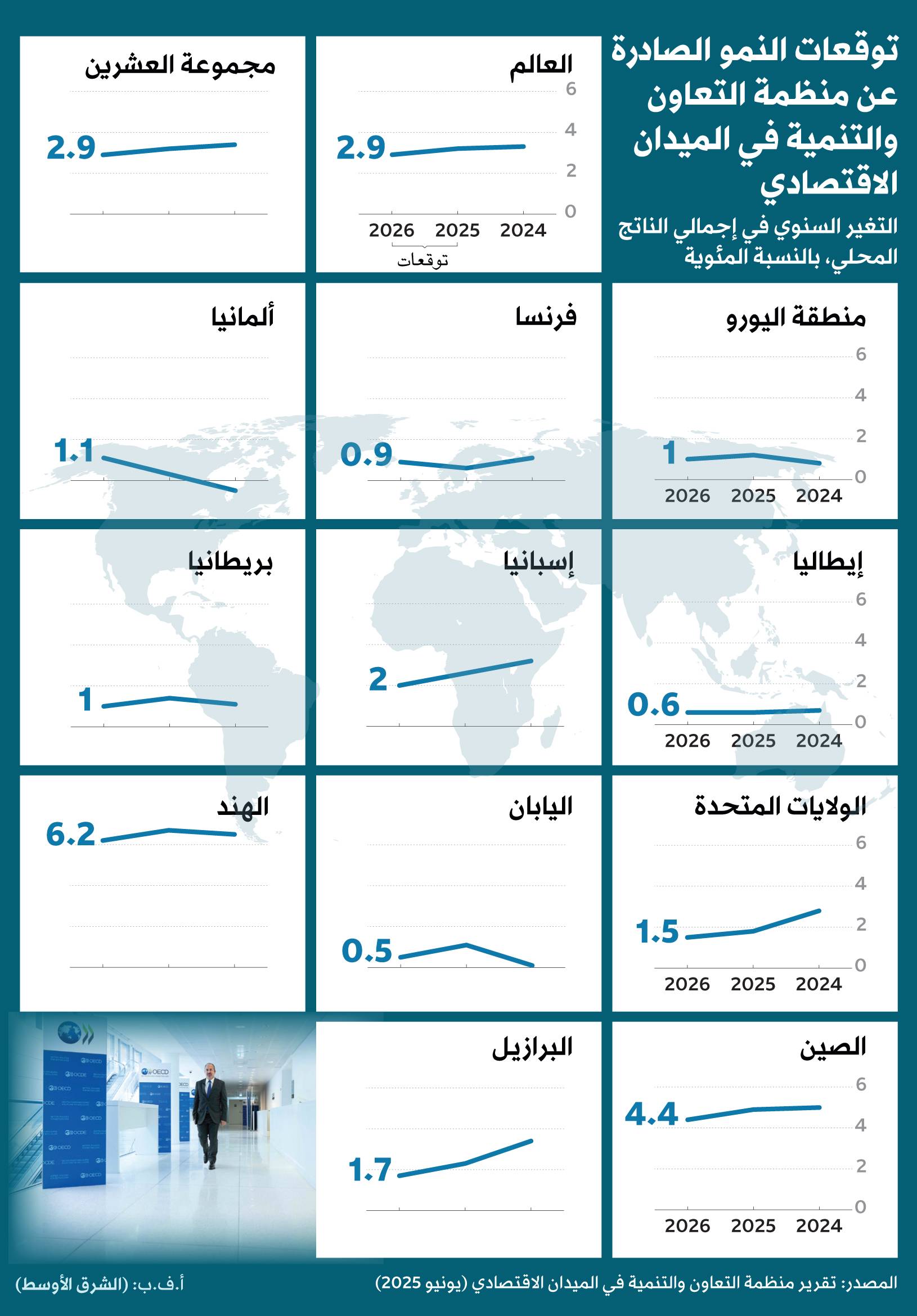 ورفعت منظمة التعاون الاقتصادي والتنمية توقعاتها للنمو لعام 2025. وتتوقع الآن نمواً عالمياً بنسبة 3.2 في المائة، مقارنة بنمو قدره 9 في المائة الذي توقعته في يونيو (حزيران)؛ بينما بقيت توقعات عام 2026 ثابتة عند 2.9 في المائة. ويمثل هذا تباطؤاً عن النمو المسجل في عام 2024 البالغ 3.3 في المائة.