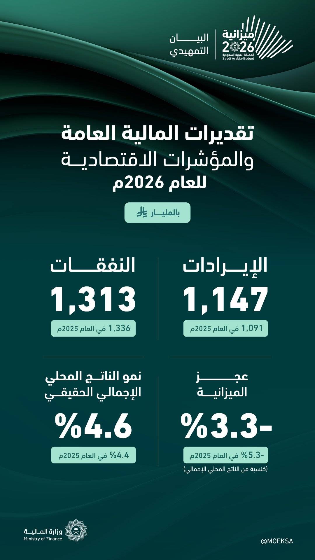 بتقديرات أولية تشير إلى نمو الناتج المحلي الإجمالي الحقيقي بنسبة 4.6في المائة، مدفوعاً بشكل رئيسي بنمو الأنشطة غير النفطية، وزارة المالية تصدر البيان التمهيدي للميزانية العامة للدولة للعام المالي 2026م