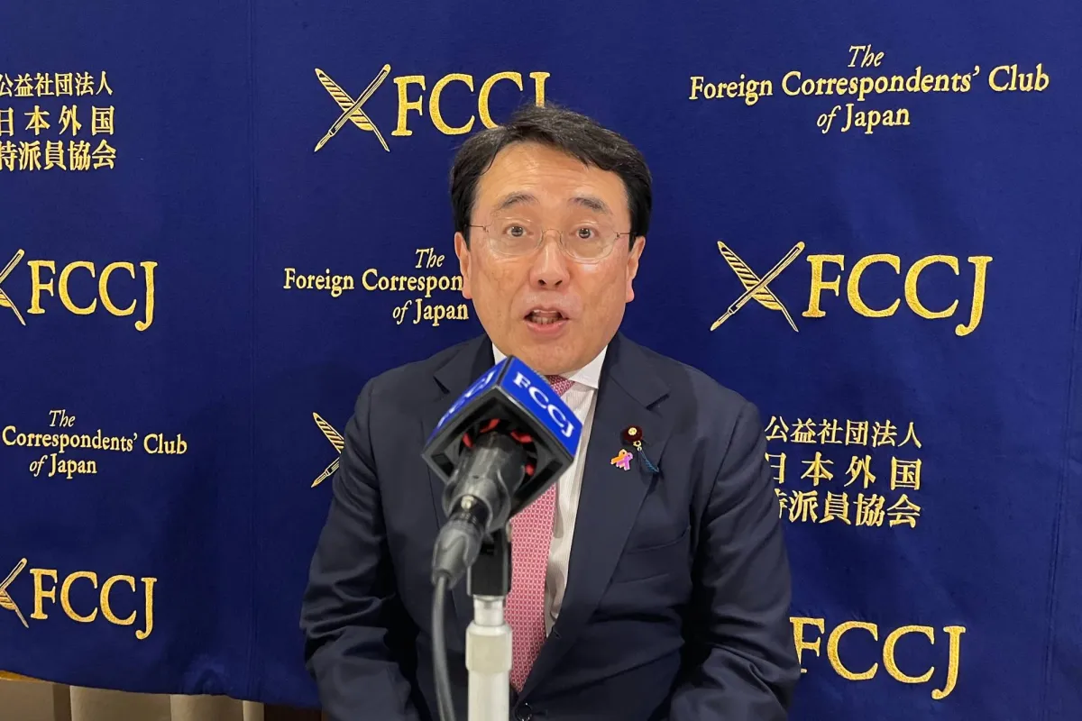 كبير المفاوضين التجاريين اليابانيين ريوسي أكازاوا في حديث مع الصحافيين بنادي المراسلين الأجانب بالعاصمة طوكيو يوم الأربعاء (أ.ب)