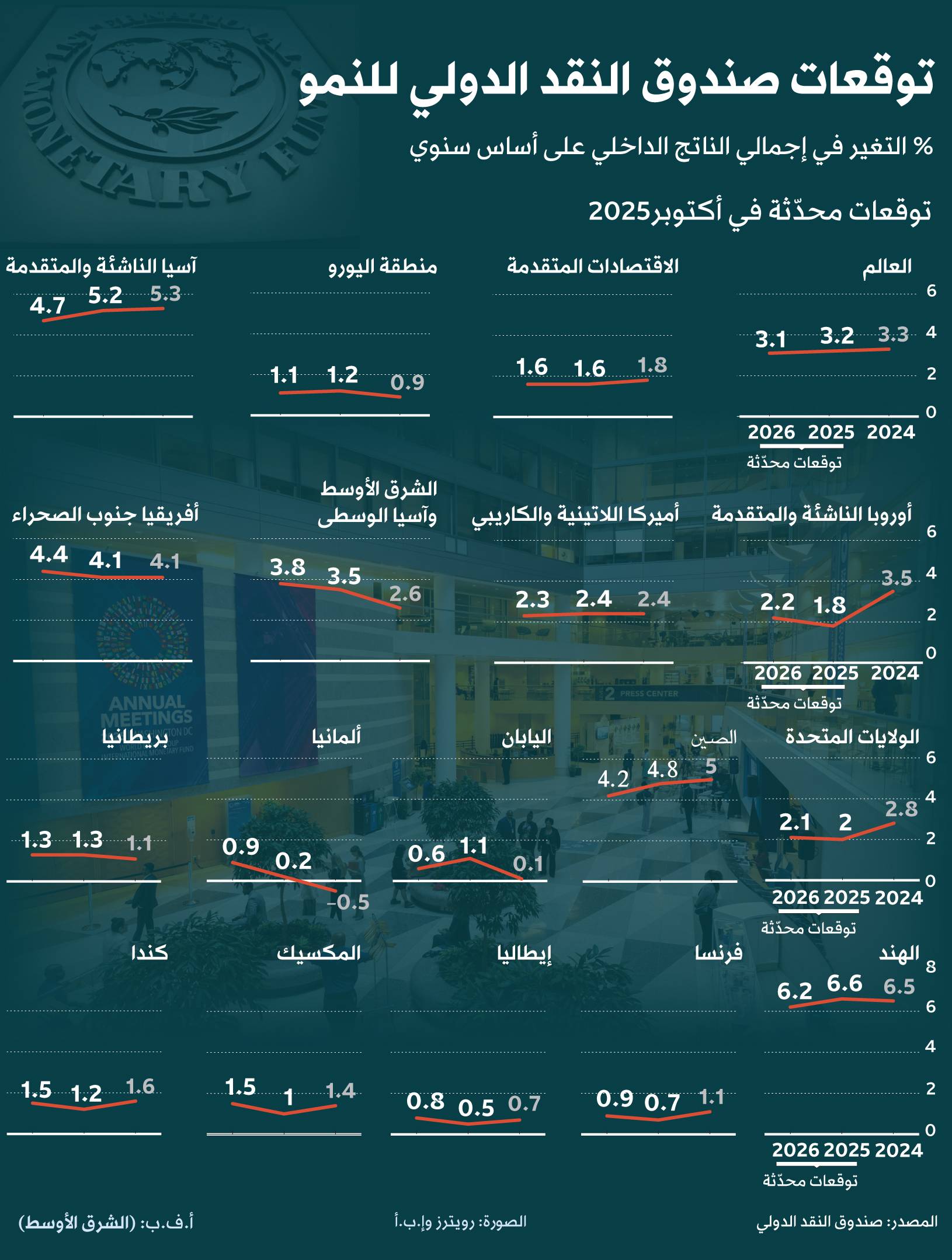 وبناءً على ذلك، رفع صندوق النقد الدولي توقعاته لنمو الناتج المحلي الإجمالي الحقيقي العالمي لعام 2025 إلى 3.2 في المائة، ارتفاعاً من 3.0 في المائة في توقعات يوليو (تموز)، و2.8 في المائة في توقعات أبريل (نيسان) التي صدرت بعد فرض ترمب التعريفات «المتبادلة» واسعة النطاق. أما بالنسبة لعام 2026، فقد أبقى الصندوق على توقعاته عند 3.1 في المائة.