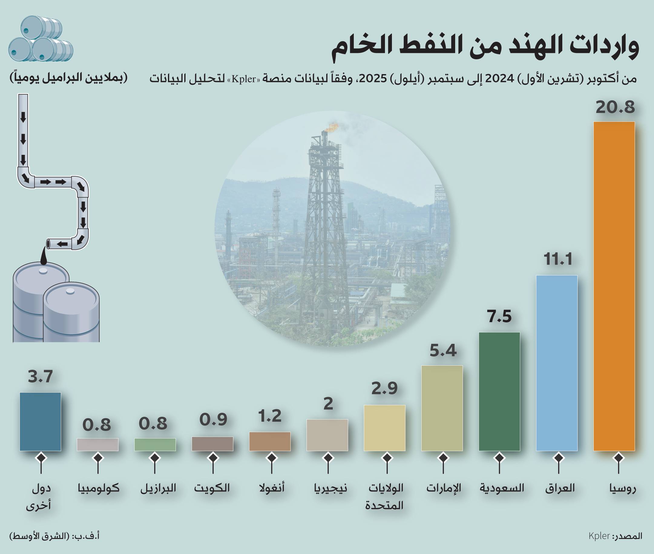 وتعد الهند ثاني أكبر مشترٍ للنفط الروسي بعد الصين. وقد استشهد ترمب بمشتريات نيودلهي من موسكو عندما أعلن عن فرض رسوم جمركية بنسبة 50 في المائة على الواردات من الهند في أغسطس (آب) الماضي.