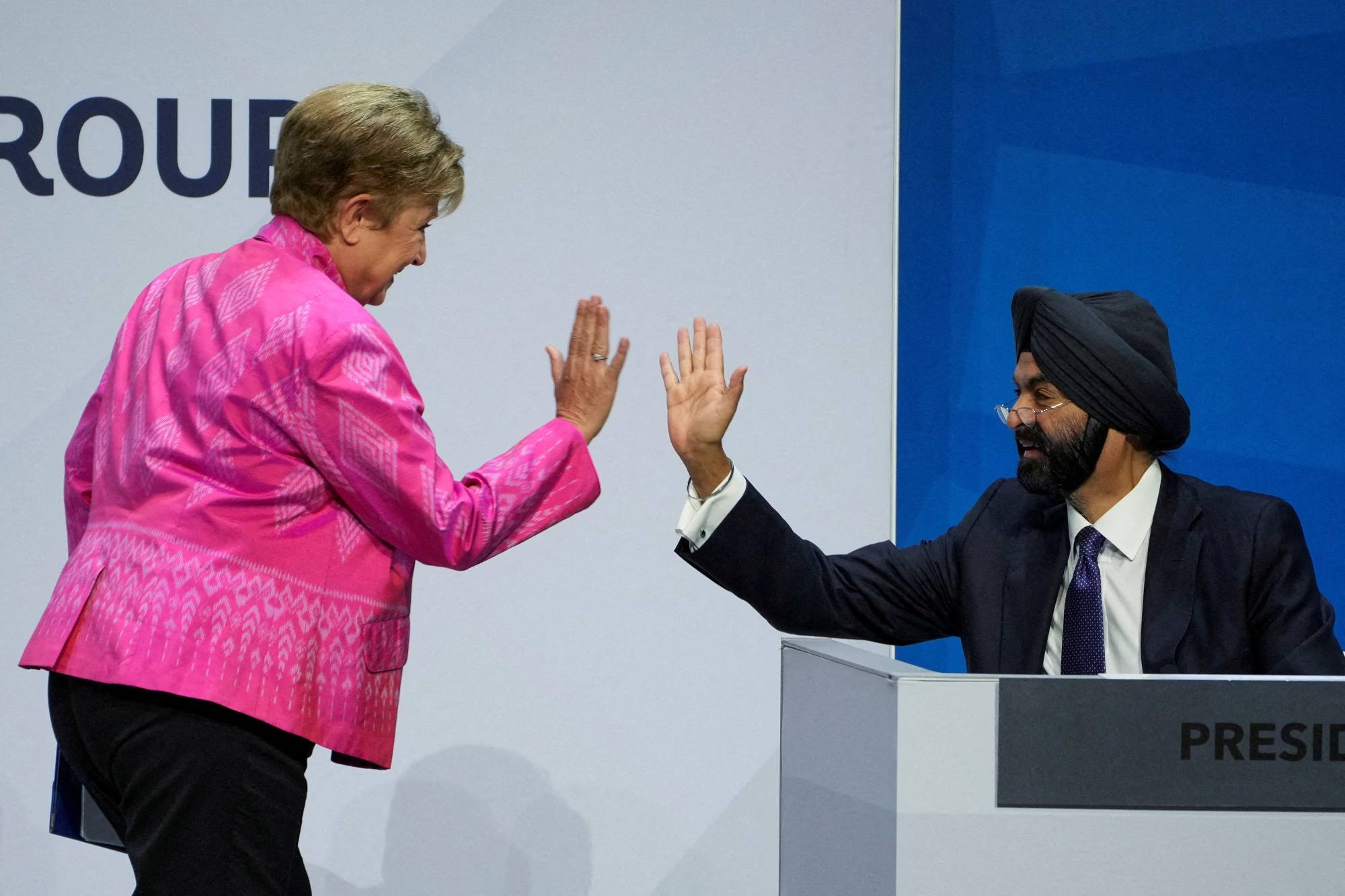 غورغييفا تصافح رئيس البنك الدولي أجاي بانغا خلال الاجتماعات السنوية لصندوق النقد والبنك الدوليين بواشنطن (رويترز)