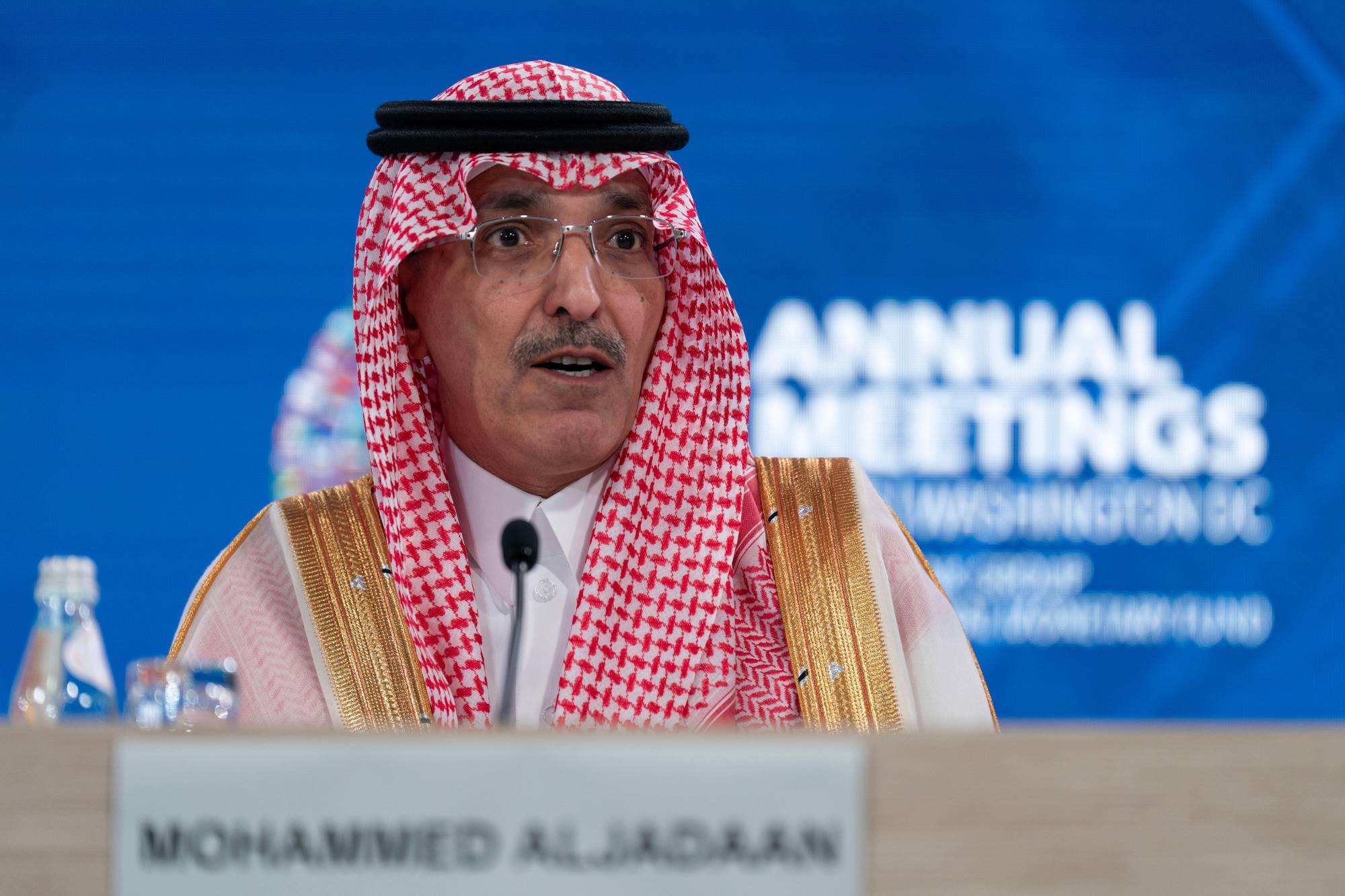 الجدعان يتحدث في مؤتمر صحافي بختام اجتماع اللجنة الدولية للشؤون النقدية والمالية (أ.ب)
