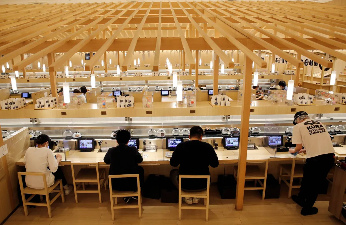 يتناول الزبائن السوشي في مطعم «كورا سوشي» بطوكيو (رويترز)