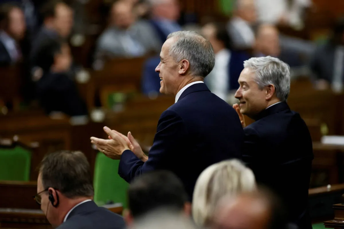 رئيس وزراء كندا مارك كارني ووزير المالية فرانسوا - فيليب شامبان يصفقان في مجلس العموم بأوتاوا 17 نوفمبر 2025 (رويترز)