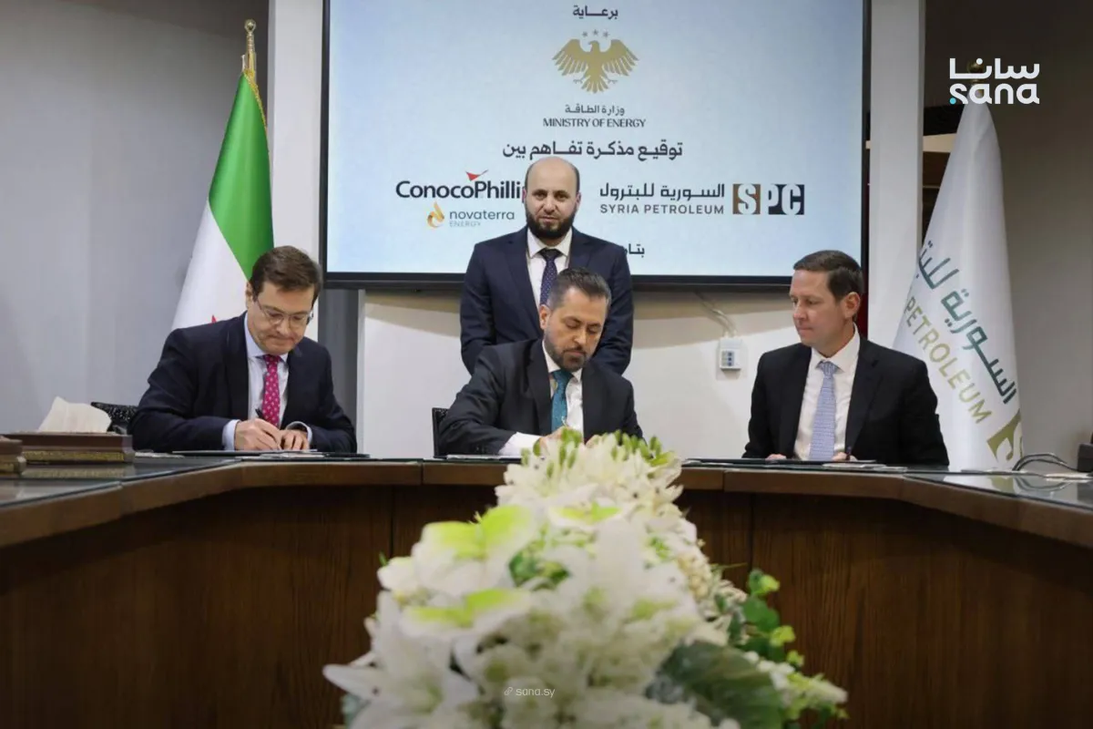وقّعت الشركة السورية للبترول، يوم الاثنين، مذكرة تفاهم مع شركتيْ «كونيكو فيليبس» و«نوفاتيرا» الأميركيتين، بحضور وزير الطاقة محمد البشير؛ بهدف تطوير قطاع الغاز وزيادة الإنتاج من الحقول القائمة، بالإضافة إلى استكشاف حقول جديدة؛ لدعم المنظومة الكهربائية والاحتياجات المنزلية.