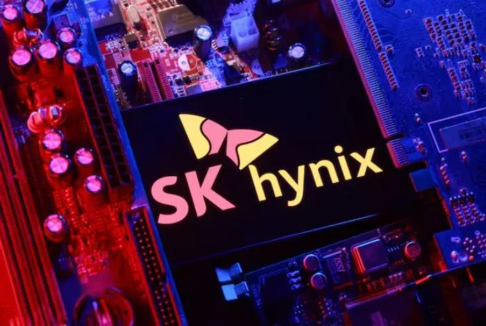 شعار شركة «إس كيه هاينكس» ولوحة أم للكمبيوتر تظهر في هذا الرسم التوضيحي (رويترز)