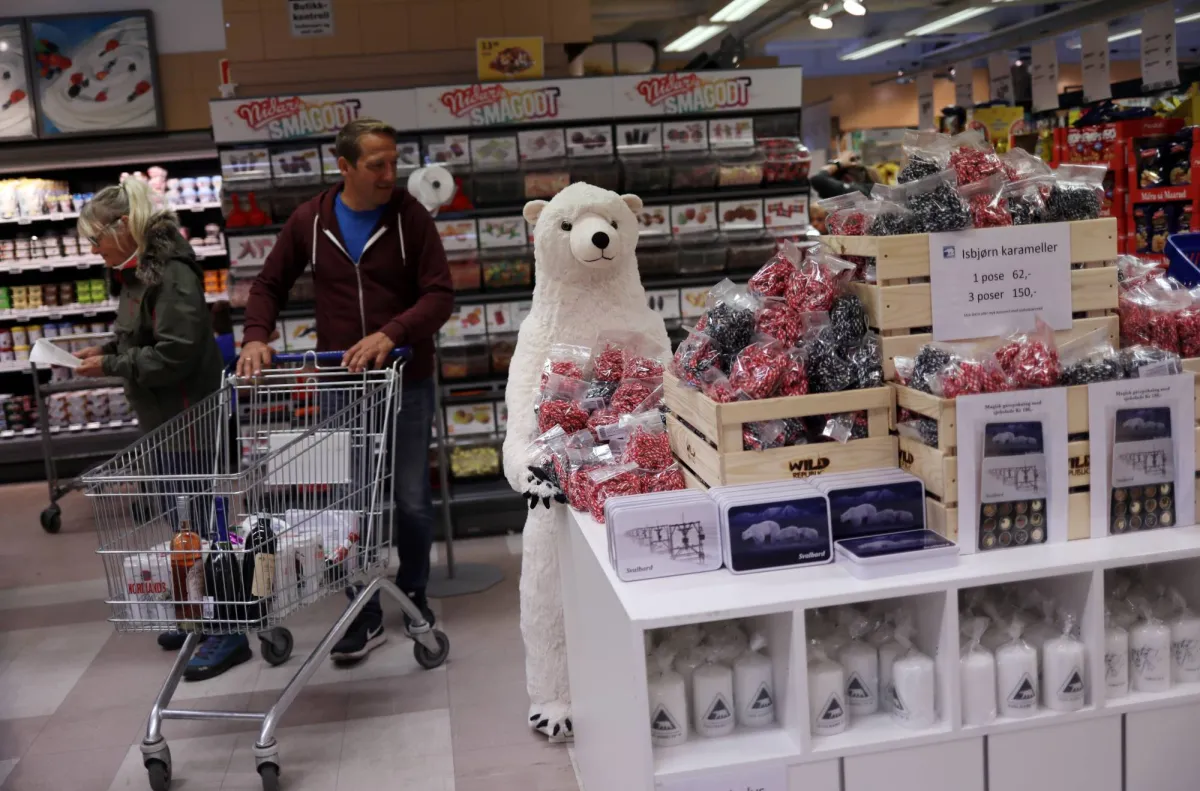 أناس يتسوقون في أقصى «سوبرماركت» شمال العالم بمدينة لونجياربيان في سفالبارد بالنرويج (رويترز)