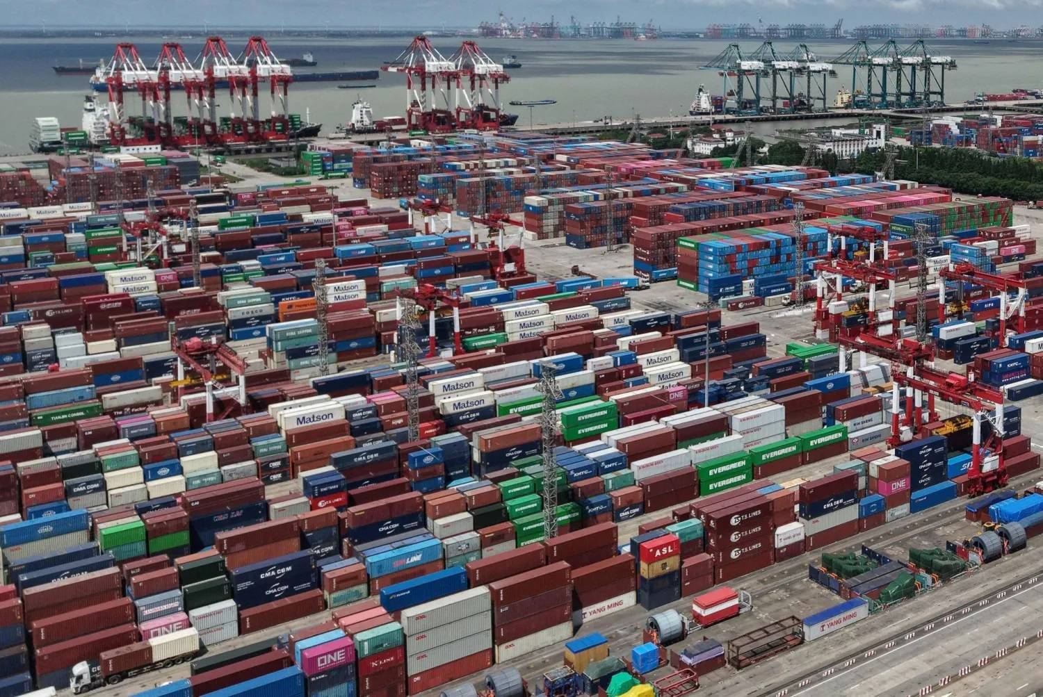 تُظهر هذه الصورة الجوية حاويات في ميناء شنغهاي الدولي بالصين (أ.ف.ب)